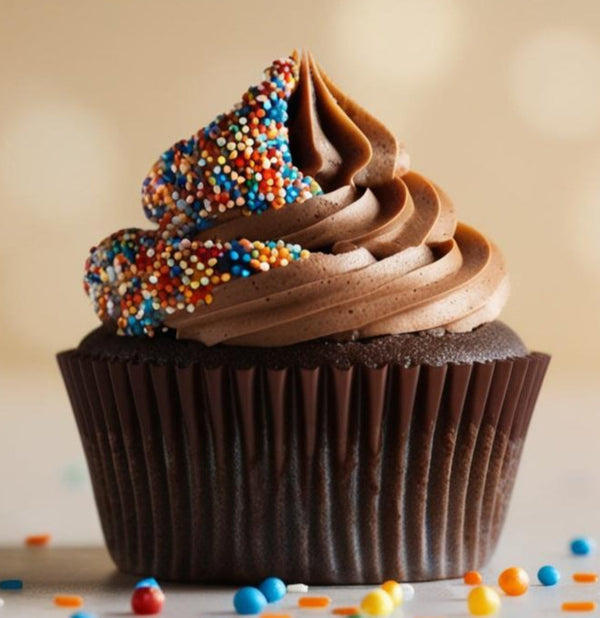 A Chocolate Birthday Cake Cupcake! Our classic Chocolate cupcake with sprinkles baked in, Chocolate buttercream or cream cheese frosting, and topped with colorful sprinkles.